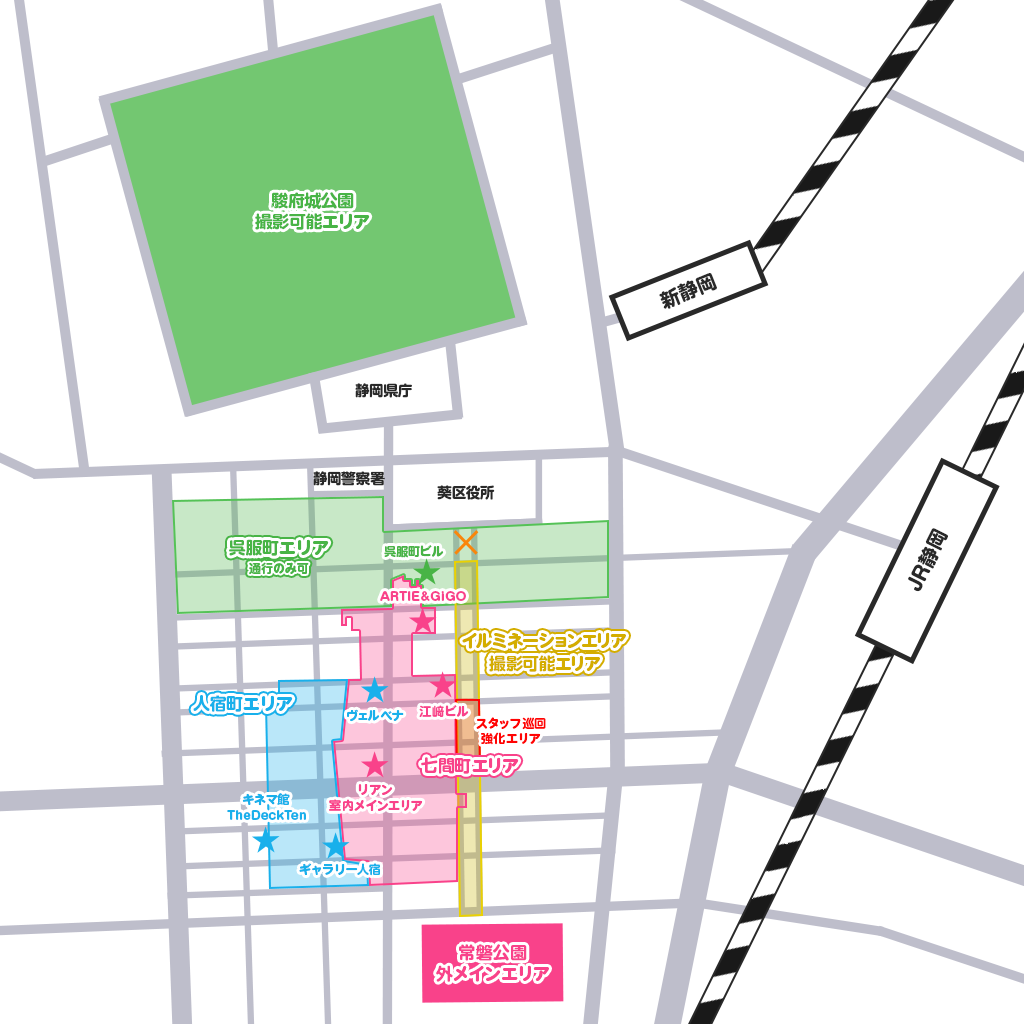 静岡市役所前の「葵スクエア」は撮影対象エリア外となりますので、ご注意ください。 - 駿府城公園
